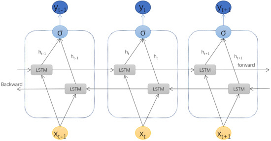Generally, the LSTM network can only obtain information from the previous input, while the bidirectional long short-term memory (Bi-LSTM) model, as a cyclic neural network composed of two independent LSTM networks, can obtain information not only from the previous input but also from the future input state. The model design idea of Bi-LSTM is to make the characteristic data obtained at moment t have the information between the past and the future at the same time, and its principle structure is shown in Figure 3.