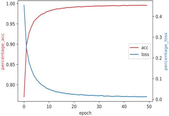 To improve the generalization performance of the model and avoid the overfitting problem, dropout technology is introduced into the model, and the Adam optimizer is used to alleviate the gradient oscillation problem. The changes in training accuracy and training loss with the increase in epochs are shown in Figure 7. In this figure, the left vertical axis is the training accuracy, the right vertical axis is the training loss, the red curve is the training accuracy, and the blue curve is the training loss. Moreover, the accuracy and loss curves converge faster, the frustration is smaller, and the curves are smoother, which proves that our model has high robustness in this dataset.