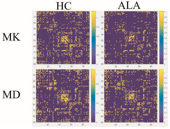 The interregional correlation matrix of mean diffusivity (MD) and mean kurtosis (MK) in the HC and ALA groups. The color bar indicates the value of the interregional parameter correlation. As is shown in the color maps, different dispersion in the MK metric were visually observed in the ALAs, but this was not observed in the MD metric.