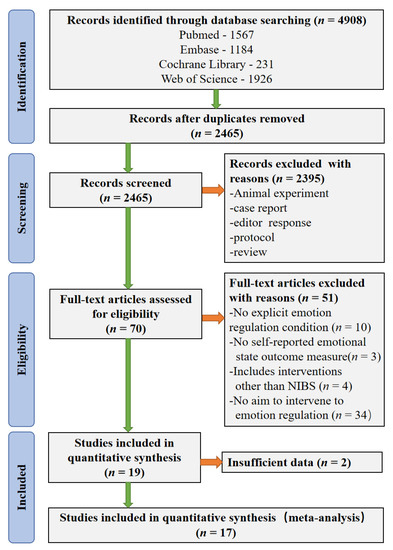 As shown in Figure 1, the systematic literature search yielded 4908 studies. The titles and abstracts of 2465 studies were assessed for eligibility after removing duplicate research. The full text evaluation was carried out in the 70 potentially relevant studies. Of these, 19 studies fulfilled the eligibility criteria. Amongst them, we did not receive a response from the corresponding author about the missing data in one study [43], and the authors of other study were unable to provide data until three months later due to isolation [69]. Finally, 17 studies were included in the meta-analysis [47,48,49,50,51,52,53,54,55,70,71,72,73,74,75,76,77]. Each of included studies had the condition of downregulate negative emotions in study procedure, but two of them did not have the condition of maintenance of negative emotions [53,77].