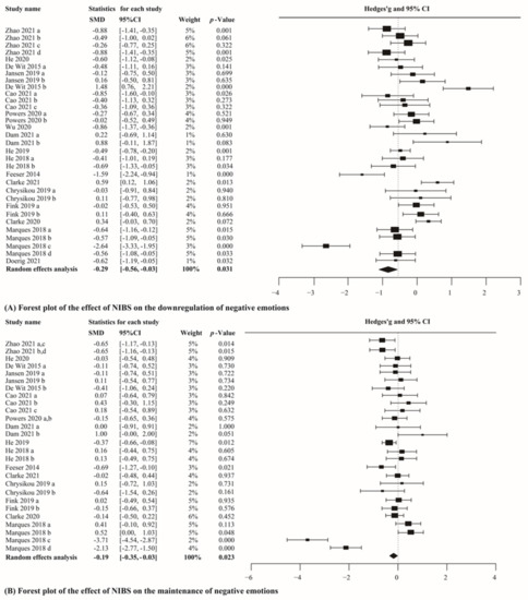 All quantitative analyses were carried out in R (version 4.0.4) package Metafor [59]. The standardized mean differences (SMD) and the Hedge’s g [60] were conducted to observe the effects of NIBS on the downregulation of negative emotions and the maintenance of negative emotions. Here, negative values indicated better downregulation of negative emotions after active stimulation. Some studies measured more than one effect size, and this nesting of effects within studies violates assumptions of independence and may contribute to potential bias in the results. To adjust for the correlation of effects within studies, a multi-level model analysis was conducted using the rma.mv function of the “Metafor” R package [61,62]. Random-effects models [63] were implemented to assess the effect of NIBS. We used Q and I2 statistics to estimate the magnitude of heterogeneity [64].