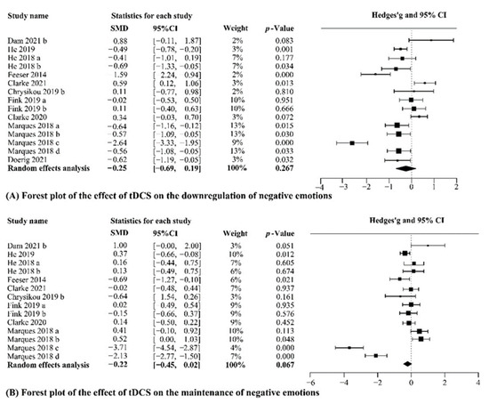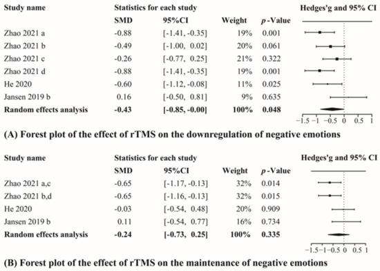 We separately analyzed the data of four studies in the downregulating condition and the maintaining condition, including 185 healthy participants. Of these, 109 only received active stimulation, and 76 only received sham stimulation. The results of the analysis in downregulating condition showed no significant heterogeneity (Q = 8.79, p = 0.118, I2 = 43.15%) and that self-reported emotion significantly differed between active and sham stimulation groups (g = −0.43, CI95% = [−0.85, −0.00], Z-value = −1.98, p = 0.048, Figure 3A). The results of the analysis in maintaining condition also showed no significant heterogeneity (Q = 5.97, p = 0.113, I2 = 35.05%), but we found no significant difference between active and sham stimulation (g = −0.24, CI95% = [−0.73, 0.25], Z-value = −0.96, p = 0.335, Figure 3B).