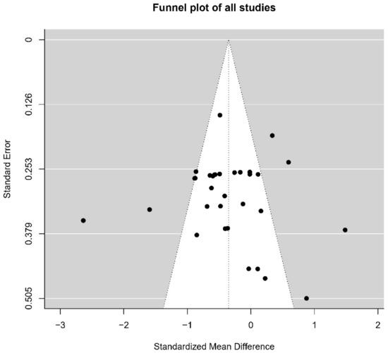 No publication biases were suggested by visual examination of funnel plots for all studies. The Egger’s regression test showed the absence of asymmetry (p = 0.473, Figure 5). PEDro scores were assessed and calculated for each study (see Supplementary Material). The mean score of all studies was 7.88, the SD was 1.11. Literature quality assessment found that most of the studies had incomplete methodological reports, such as blinding procedures that were not explained. In addition, although many studies randomly grouped participants, they did not report how the random sequence was generated and whether group assignments were hidden from the researchers.