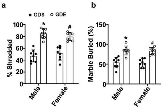 3.5. Effects of GDE Treatment on Stereotyped Repetitive Behavior in the NST and MBT