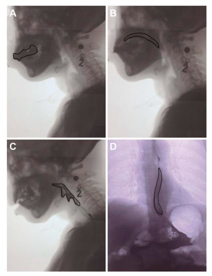 - Logemann, J.A. Manual for the Videofuorographic Study of Swallowing; Pro-ED: Austin, TX, USA, 1993. [Google Scholar]