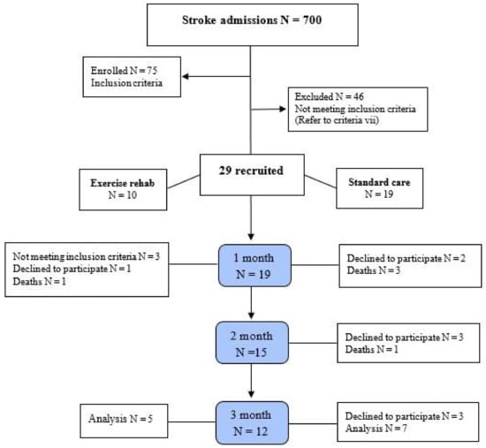 - Sandberg, K.; Kleist, M.; Falk, L.; Enthoven, P. Effects of Twice-Weekly Intense Aerobic Exercise in Early Subacute Stroke: A Randomized Controlled Trial. Arch. Phys. Med. Rehabil. 2016, 97, 1244–1253. [Google Scholar] [CrossRef]