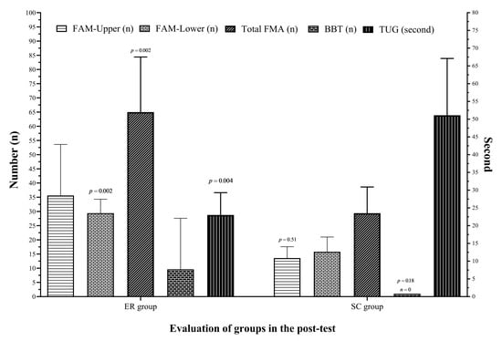 Comparison of groups in assessments. ER = Exercise rehabilitation, SC = Standard care, FMA = Fugle-Meyer Assessment, BBT = Box and Blocks Test, TUG = Time Up and Go.