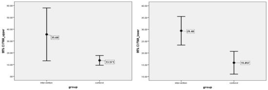 Error bars plots showing result of Fugl-Meyer Upper & Lower function between two groups.