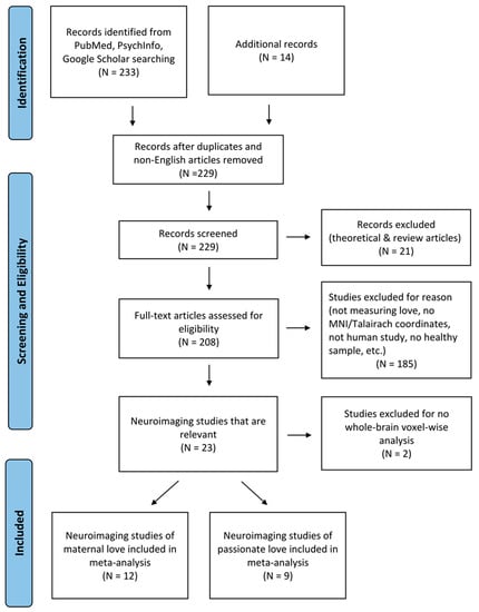 Human neuroimaging studies of maternal and passionate love were selected using a systematic search process. Peer-reviewed articles published in English between January 1997 and July 2021 were searched from the National Center for Biotechnology Information (NCBI) PubMed database (i.e., Medline), PsychInfo, and Google Scholar, using the following keyword combinations: (“romantic love” or “passionate love” or “maternal” or “love”) and (“fMRI” or “functional magnetic resonance imaging” or “neuroimaging” or “PET” or “positron emission tomography”). In addition, we searched the peer-reviewed articles listed in relevant papers through the “similar article” function in the PubMed database and the reference lists in each relevant paper. As a result, 102 unique papers were found. Two of the authors (H.C. Shih and C.M. Huang) confirmed the inclusions of the identified studies, and the search of literature and selection of studies process are visualized in Figure 1.