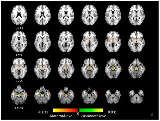 The realm of human attachment has been predominantly defined as the interpersonal relationship [,,]. A recent study extends the concept of attachment to the relationship between a person and an object and conducted a meta-analysis of love to investigate neural substrates of brand love which has been shown to reveal strong ties between consumers and brands (i.e., “brand attachment”) and compared it with those of maternal and romantic love []. The study, when the loose criterion was applied (p < 0.001 uncorrected), reported that the brain regions of putamen and insula were commonly recruited for brand love, maternal love, and passionate love. However, brand love appears to show different dispositions from the other two types of interpersonal love, with the brain activation of dorsal striatum for brand love whereas distributed cortical areas and globus pallidus for maternal love and NA and VTA for passionate love []. These results highlight the similarity and discrepancy between brand love and interpersonal love, however, the common and dissociable neutral substrates associated with maternal and passionate love from the neurobiological and evolutionary perspectives remain unclear.