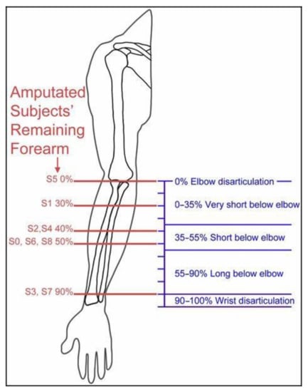 For this study, we recruited a subject who received a left wrist amputation due to an accident at the age of ten (age = 63, male). The subject was in healthy condition without phantom limb sensation and had not had any neurological conditions during the study. The subject showed average cognitive performance and could follow the instructions provided during the study. The subject’s residual limb is more than 90% (Figure 1), and he did not have any skin damage on the forearm. Therefore, an sEMG prosthesis developed by our lab could be used for rehabilitation training in the current study (Figure 2; also see below for details). The subject reported that he had never worn a prosthesis, never participated in similar study, and never deliberately exercised the residual limb after the amputation before. We informed him about all details regarding the training procedures prior to the study and obtained a signed consent form from him. The Ethics Committee of Jiangsu Provincial People’s Hospital approved all experimental procedures.