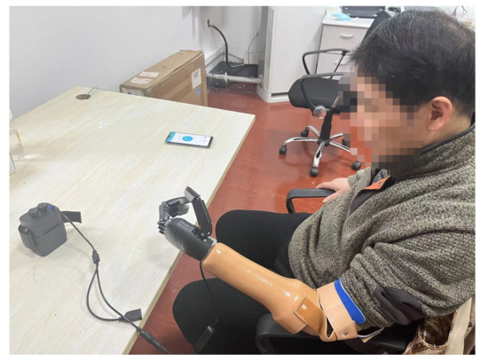In this study, the participant received rehabilitation training for six weeks. He was trained six days a week and three hours per day. Each rehabilitation training session consisted of controlling the prosthesis (using EMG) to perform multiple movements, including the following: (1) thumb bending; (2) index finger bending; (3) middle finger bending; (4) fist; (5) pinching; (6) OK gesture; (7). a combination of either the fist, pinching, or OK gesture with the thumb and index finger spread out. The subject was instructed to practice the above movements at his own pace during the training session. After the first week of training, we added more complicated movements to our training session, including movements that frequently occur in daily life (e.g., grabbing a water mug and drinking water, transporting an object, opening and closing the door). An example training session setup is shown in Figure 3.