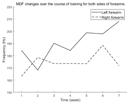 MDF calculated from EMG is a reliable measure of different muscle fiber compositions (see the part of sEMG of Data Processing in Materials and Methods for details). We measured sEMG from the participant’s forearms before and at the end of each week’s training. Figure 4 shows the MDF values over the training period for both arms. We observed an increase in the MDF of the forearm of the left or amputated side over the training period, suggesting an increase in the proportion of fast muscle fibers. In comparison, the right or control side showed no noticeable change during the six weeks of training.