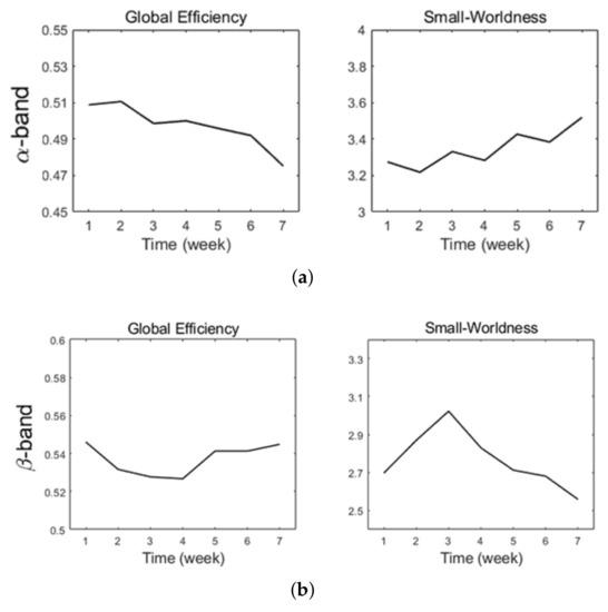 -band network showed a different trend when compared with the -band network. Specifically, we found an initial decrease in global efficiency for the first 2–3 weeks, which then increased for the rest of the experiment. Small-worldness increased for the first three weeks and then decreased for the remaining experimental period. These results suggest complex changes in the -band network’s efficiency and ability to integrate information.