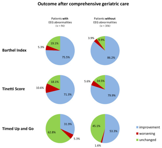 In recent decades, health care systems have been faced with an increasing number of older multimorbid patients, requiring continuous structural adjustment. Among other things, this has prompted the emergence of comprehensive geriatric care (CGC), a multidisciplinary intervention strategy developed to satisfy medical care requirements but also focusing on patients’ functional abilities in order to improve and/or maintain their independence [1,2,3]. Many investigations have indicated that patients might benefit from this approach [4,5]. However, there are a number of factors that may influence a patient’s functional abilities as well as their ability to recover [6,7]. In particular, disorders of the central nervous system such as ischemic or hemorrhagic stroke, tumors, epilepsy, encephalopathy, delirium, or dementia may cause deficits and affect rehabilitation [6,7]. Electroencephalography (EEG) is an established neurological procedure that provides valuable information for estimating and monitoring cerebral function and determines cognitive performances [8]. In this context, EEG abnormalities have been identified in many investigations as surrogates for the course of diseases as well as for treatment results [9,10]. In conclusion, EEG findings presumably could help to estimate performances in older patients scheduled for CGC. To the best of our knowledge, no data are available evaluating EEG findings in older patients undergoing CGC.
