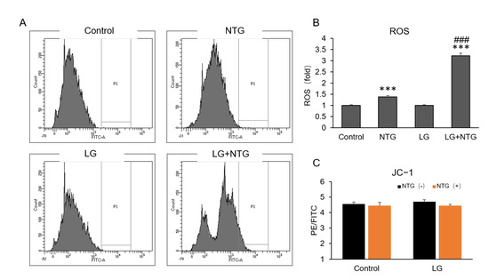 More ROS are induced by NTG in low-glucose condition in astrocytes. (A) ROS of astrocytes were detected by flow cytometry after NTG treatment at a dose of 2 μg/mL for 1 h. Control, glucose 4.5 g/L; low glucose (LG, glucose 1 g/L). (B) Quantitative analysis showed that ROS level in low-glucose condition was about 2-fold compared with normal glucose after treated by NTG. (C) Mitochondrial membrane potential detected by JC−1 showed no change in different conditions. ROS, reactive oxygen species ***, p < 0.001, compared with control; ###, p < 0.001, compared with NTG.
