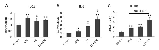 More inflammatory factors are produced in low-glucose group. Astrocytes were collected after treatment with different concentrations of glucose and NTG (2 μg/mL) for 4 h. mRNA levels of IL-1β, IL-6 and IL-1R were detected by qRT-PCR. (A) Both NTG and low glucose induced IL-1β production. (B) IL-6 was induced by NTG and low glucose. (C) IL-1Ra was induced by NTG and low glucose. Compared with control, * p < 0.05, ** p < 0.01. Compared with NTG, # p < 0.05.