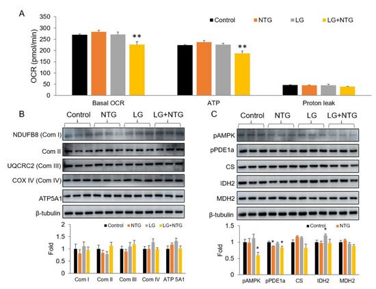 NTG reduced ATP production in low glucose by inhibiting AMPK activity. (A) Seahorse was used to detect oxygen consumption rate (OCR). A total of 5 × 104 astrocytes were seeded in a well of 24-well plate used in XFe24 Seahorse analyzer. n = 5. Basal OCR and OCR for ATP production and proton leak were calculated with the instruction of Seahorse. (B) Proteins of mitochondrial complexes underwent no significant change after the treatment of NTG, neither in high-glucose nor in low-glucose conditions. (C) Protein level of pAMPK reduced significantly in the low-glucose and NTG group. NTG 2 μg/mL, treated for 4 h. AMPK, AMP-activated protein kinase; CS, citrate synthase; IDH, isocitrate dehydrogenase 2; MDH2, malate dehydrogenase 2. Compared with control, * p < 0.05, ** p < 0.01.