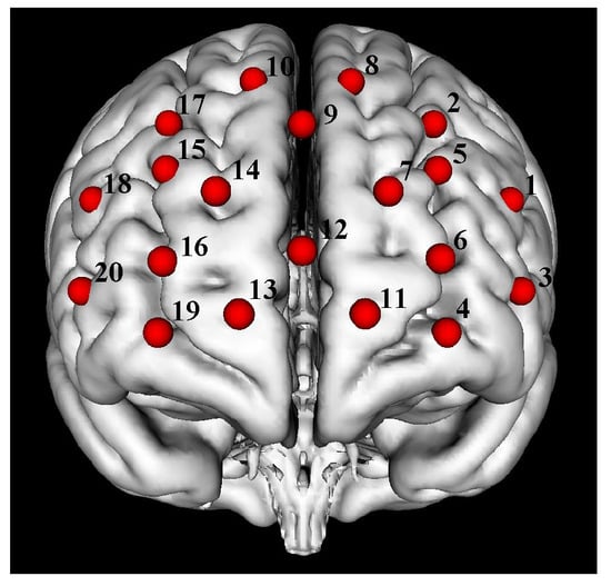 Channel position map. The 20 channels composed of fNIRS optodes were located in the prefrontal area. The red spheres indicate channels and the black numbers show the channel numbers.