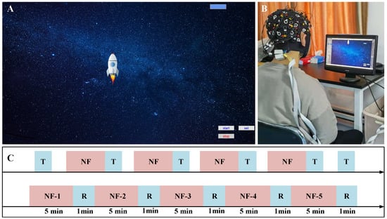 (A) neurofeedback system interface, (B) participant neurofeedback training scene, (C) training paradigm design; NF = Neurofeedback, T = Test, and R = Rest.