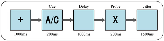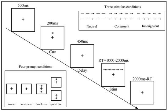 The experiment process is shown in Figure 4. Before the start of each trial, the screen first showed a 500 ms fixation point “+” and then an alert signal for 200 ms. Next, a 450 ms fixation point appeared, and then the target stimulus was shown. If the target stimulus appeared to show no response within 2000 ms, participants entered the next trial. The average time for each trial was 3100 ms, and the program ran for 30 min. The formal experiment encompassed a total of 480 trials.
