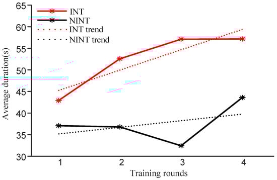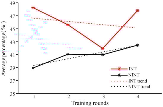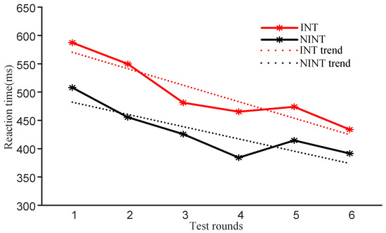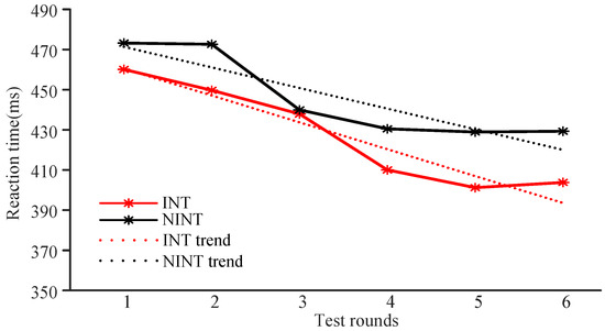 The results of reaction time for the INT group are shown in Figure 7 (in red). The average reaction times for the INT group showed a downward trend, though it was not a continuous decrease. However, the overall decline was relatively large. Compared with the pre-test, the average reaction times for all participants in the INT group decreased significantly (). The results of reaction time for the NINT group are shown in Figure 7 (in black). The average reaction time trend in this group decreased, but this was not a continuous effect (similar to the results for the INT group). The overall decline was relatively substantial, which is basically in line with the trends of participants in the INT group. The average reaction time of participants decreased significantly (). The average reaction times for the INT and NINT groups both showed a downward trend. We calculated the linear trend for the two sets of data and found that the slope of the trend line for the INT group ( = −28.89) was greater than the slope of the trendline of the NINT group ( = −21.33).