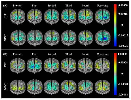 We used GLM to calculate the matrix from the Oxy-Hb and Deoxy-Hb data for each group and obtained the brain activation of each test. The results are shown in Figure 8. For the Oxy-Hb data, The main activation areas of the INT and NINT groups were near the middle and dorsolateral prefrontal areas, which are relevant to the high-level cognitive functions such as short-term memory and auditory language attention. In the first five tests, for both groups, the participants’ activation areas gradually expanded. This was more obvious for the INT group. Compared with the NINT group, the INT group had more channels with positive activation in the first five tests. In terms of the average activation level, the INT group was also significantly higher than the NINT group (). However, the results of the sixth test showed that the activation area became smaller and the position transferred to the right prefrontal cortex. For the Deoxy-Hb data, the activation of the INT group was mainly located at the dorsolateral prefrontal cortex, but that of the NINT group was mainly located at the middle prefrontal cortex. Along with the training, the average activation level of both groups increased gradually. Similar to the Oxy-Hb, the average activation level of the INT group was significantly higher than the NINT group after training (). Different form the Oxy-Hb, the average activation level of the post-test was higher than the pre-test in both groups.