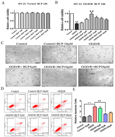 BCP alleviated OGD/R injury-induced decreases of cell viability and apoptosis. (A) Role of BCP on cell viability of HT-22 cells (normal condition). (B) Role of BCP on cell viability of OGD/R cells. (C) HT-22 cells were observed by microscopy after treatment with varying doses of BCP (OGD/R, 24 h). (D) BCP reduced the apoptosis of OGD/R cells, as indicated by flow cytometry. (E) Quantitative analysis of flow cytometry results. (n = 3; ** p < 0.01 OGD/R group vs. control group; ## p < 0.01 OGD/R + BCP 10 μM group vs. OGD/R group).