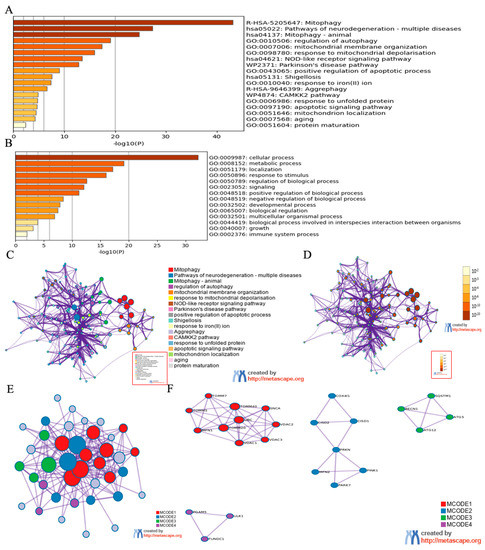 Identification of mitophagy regulators by Metascape Online Analysis. (A) Bar graph of enriched terms across input mitophagy regulator lists, colored by p-values. (B) The top-level Gene Ontology biological processes can be viewed here. (C) Network of enriched terms: colored by cluster ID, where nodes that share the same cluster ID are typically close to each other. (D) Colored by p-value, where terms containing more genes tend to have a more significant p-value. (E,F) Protein-protein interaction network and MCODE components identified in the mitophagy regulator lists.