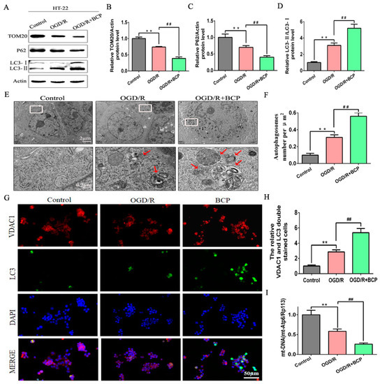 BCP enhanced mitophagy in OGD/R-injured HT-22 cells. (A–D) Representative Western blots showing protein levels of p62 and TOM20, and the protein ratio of LC3-II/LC3-I. p62 and TOM20 protein levels were normalized to β-actin. (E,F) Transmission electron microscopy revealed that BCP pretreatment increased numbers of autophagosomes in HT-22 cells after OGD/R. Red arrows indicate autophagosomes. (G,H) Double-immunofluorescence staining for LC3B and VDAC1 in HT-22 cells at 24 h after reperfusion, VDAC1 (red) and LC3B (green) double-stained cells (yellow) indicate mitophagy (scale bar = 50 μm, 400× magnification). (I) Relative mitochondrial DNA levels indicated by the ratio of mt-Atp6 were assessed by qRT-PCR. (n = 3; ** p < 0.01 OGD/R group vs. control group; ## p < 0.01 OGD/R + BCP group vs. OGD/R group).