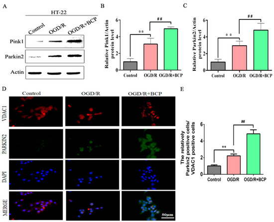 BCP activates the Pink1/Parkin2 pathway in OGD/R-injured HT-22 cells. (A–C) Representative Western blots showing protein levels of Pink1 and Parkin2. Protein levels were normalized to β-actin. (D,E) Double-immunofluorescence staining for VDAC1 and Parkin2 in HT-22 cells at 24 h after reperfusion. VDAC1 (red) and Parkin2 (green) double-stained cells (yellow) indicate mitophagy. (Scale bar = 50 μm, 400× magnification). (n = 3; ** p < 0.01 OGD/R group vs. control group; ## p < 0.01 OGD/R + BCP group vs. OGD/R group).