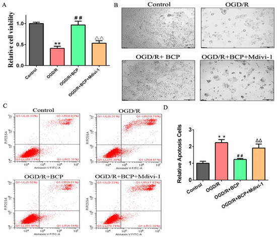 Facilitating mitophagy plays an important role in BCP protection against OGD/R injury of HT-22 cells. (A) Effect of BCP on cell viability of OGD/R-injured HT-22 cells after treatment with the mitophagy inhibitor Mdivi-1. (B) HT-22 cells were observed by microscopy after treatment with Mdivi-1. (C,D) Flow cytometry and quantitative analysis of apoptosis of OGD/R cells after treatment with Mdivi-1. (n = 3; ** p < 0.01 OGD/R group vs. control group; ## p < 0.01 OGD/R + BCP group vs. OGD/R group; △△ p < 0.01 Mdivi-1 group vs. BCP group).