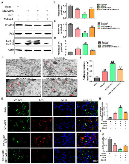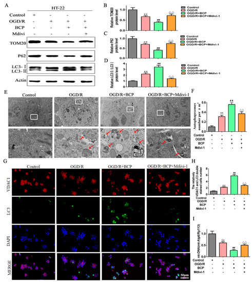 BCP-mediated mitophagy was suppressed by a mitophagy inhibitor. (A–D) Representative Western blots showing protein levels of p62 and TOM20, and the protein ratio of LC3-II/LC3-I after treatment with the mitophagy inhibitor Mdivi-1. p62 and TOM20 protein levels were normalized to β-actin. (E,F) Transmission electron microscopy revealed that BCP pretreatment increased numbers of autophagosomes in HT-22 cells after treatment with Mdivi-1. (Scale bar = 2 μm). Red arrows indicate autophagosomes. (G,H) Double immunofluorescence staining for LC3B and VDAC1 in HT-22 cells after treatment with Mdivi-1. VDAC1 (red) and LC3B (green) double-stained cells (yellow) indicate mitophagy (scale bar = 50 μm, 400× magnification). (I) Relative mitochondrial DNA levels indicated by the ratio of mt-Atp6/Rpl13 were assessed by qRT-PCR. (n = 3; ** p < 0.01 OGD/R group vs. control group; ## p < 0.01 OGD/R + BCP group vs. OGD/R group; △△ p < 0.01 Mdivi-1 group vs. BCP group).