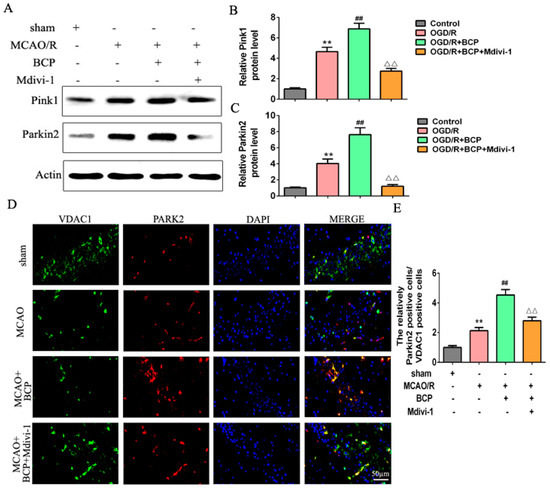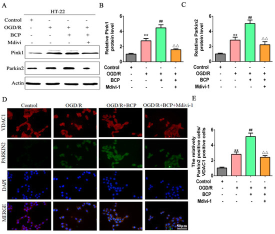 Pink1/Parkin2 pathway-dependent mitophagy is implicated in BCP-induced mitophagy. (A–C) Representative Western blots showing protein levels of Pink1 and Parkin2 after treatment with the mitophagy inhibitor Mdivi-1. Protein levels were normalized to β-actin. (D,E) Double-immunofluorescence staining for VDAC1 and Parkin2 in HT-22 cells after treatment with Mdivi-1. VDAC1 (red) and Parkin2 (green) double-stained cells (yellow) indicate mitophagy. (Scale bar = 50 μm, 400× magnification). (n = 3; ** p < 0.01 OGD/R group vs. control group; ## p < 0.01 OGD/R + BCP group vs. OGD/R group; △△ p < 0.01 Mdivi-1 group vs. BCP group).