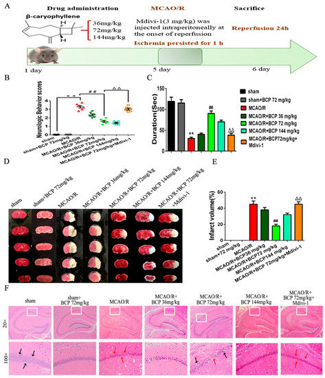 To determine whether BCP contributes to protection against CIR in a manner dependent on mitophagy in vivo, as shown in Figure 8A, C57BL/6 mice were divided into groups treated with 36 mg/kg, 72 mg/kg, or 144 mg/kg BCP (low-, middle-, and high-dose groups) before undergoing a transient MCAO procedure. Mdivi-1 was injected intraperitoneally at the onset of reperfusion (3 mg/kg). Mice were sacrificed 24 h after reperfusion. Severe neurological deficits were present in the MCAO/R group compared with sham and BCP-treated sham groups, and BCP treatment reduced neurological scores in a dose-dependent manner (Figure 8B). MCAO/R group mice exhibited reduced times in rotarod testing compared with respective sham and BCP-treated sham groups. Treatment with BCP increased times spent on the rotarod after MCAO/R in a dose-dependent manner (Figure 8C), especially 72 mg/kg BCP, which prominently protected against MCAO/R-mediated nerve injury. However, Mdivi-1 abolished these neuroprotective effects, as indicated by increased neurologic scores and reduced times on the rotarod (Figure 8B,C). Infarct volumes were assessed by TTC. Compared with outcomes in the MCAO/R group, BCP treatment markedly decreased infarct volumes in a dose-dependent manner, suggesting that BCP improved functional outcomes after MCAO/R injury (Figure 8D,E). In addition, H&E stained sections were analyzed the necrotic cells in the hippocampal CA1 region. As shown in Figure 8F, neurons in the hippocampal CA1 region were arranged in nomal rows, shown intact cell structures, and had clear nuclear outlines in sham and BCP-treated sham groups (black arrows). After 24 h of reperfusion, neurons were necrotic and shrank, cellular edema, and nuclear condensation (red arrows). However, BCP significantly prevented neuron damage and improved the pathology associated with MCAO/R in a dose-dependent manner. Interestingly, Mdivi-1 blocked this neuroprotection in MCAO/R mice, as indicated by increased infarct volumes and CA1 neuronal injury (Figure 8D–F). These results suggest that BCP protected against MCAO/R injury in vivo in an autophagy-dependent manner.