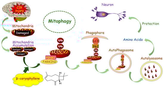 Our study indicates that mitophagy was activated following CIR injury and BCP pretreatment could further activate CIR-induced mitophagy to clear damaged mitochondria to reduce brain damage. This protective mechanism against CIR injury (Figure 11) occurs through recruitment of Pink1 and Parkin2 on the outer membrane of mitochondria, which increased the LC3-II/LC3-I protein ratio and decreased expression of p62. Subsequently, formation of phagophores containing damaged mitochondria occurs, which fuse with lysosomes and transform into autolysosomes. By this mechanism, damaged mitochondria can be degraded to produce amino acids and other nutrients for neurons.