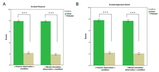 Mean Evoked Pleasure (A) and Evoked Approach Desire (B) (mean ± SEM) on 44 images (22 presenting a polluted environment and 22 presenting a clean environment) according to Passive observation condition (left side of each panel) and Mental simulation observation condition (right side of each panel). Statistical differences are shown as *** p < 0.001.