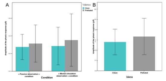 Mean amplitude of the phasic response of electrodermal activity for Clean (blue) and the Polluted (Grey) condition considering the difference between the passive and mental simulation observation conditions (A) or averaged on all experimental conditions (B).