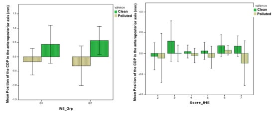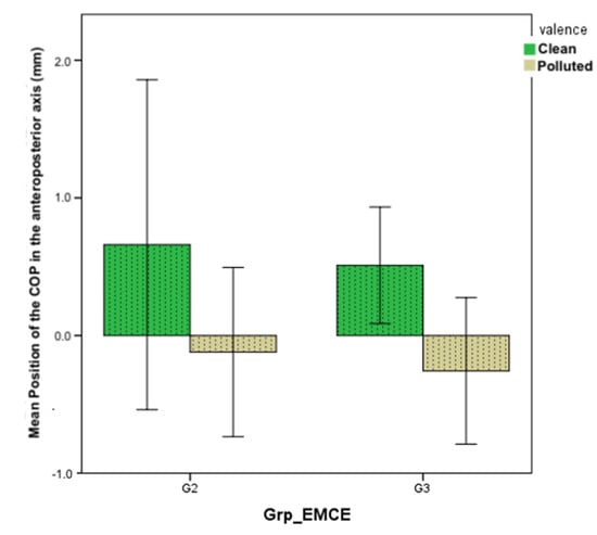 When viewing a polluted image, the subjects tend to move back, and the value of the displacement of the COP is then negative (M = −0.334 ± 1.42 mm in passive condition, M = −0.3454 ± 1.43 mm in mental simulation condition). Clean images tend to generate approach behavior reflected by positive values of COP displacement (M = 0.38 ± 1.25 mm in passive condition and M = 0.7812 ± 1.42 mm in mental simulation condition).