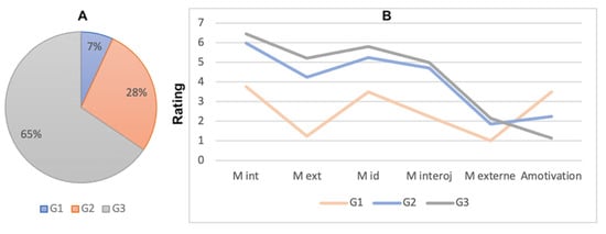 For the EMCE scale, participants are grouped into three groups based on their response (Figure 7, left side). The first group, G1, contained 7% of all cases (n = 2) with low scores on all types of motivation except amotivation. The second group represented 28% of participants (n = 8) with moderate scores on all five MTES subscales. Finally, group three, G3, was the largest, comprising 65% of subjects (n = 20). This group scored high on all types of motivation except amotivation (Figure 7B).