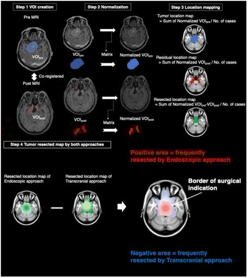 The workflow of voxel-based-lesion mapping. Step 1: The creation of the voxels-of-interest (VOIs) from pre-and post-MRI after co-registration. Step 2: Reslicing of VOIs using a matrix obtained from the transformation of pre-and post- magnetic resonance images into normal brain. Step 3: Tumor and residual location maps were created by the sum of normalized VOIpre and normalized VOIpost divided by a number of cases, respectively. Resected location map was created by the subtraction of the residual location map from the tumor location map divided by a number of cases. Step 4: Tumor resected maps by both approaches were obtained by subtracting the resected location map of transcranial approach from that of endoscopic approach. VOI: the voxels-of-interest, MRI: magnetic resonance images.
