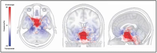 Voxel-based-lesion mapping on MRI allows quantitative visualization of the therapeutic effect of brain tumors []; therefore, the authors of this study aimed to objectively evaluate resected areas and visualize the suitable location in each approach of EEA and TCA for surgical resection of SBM.