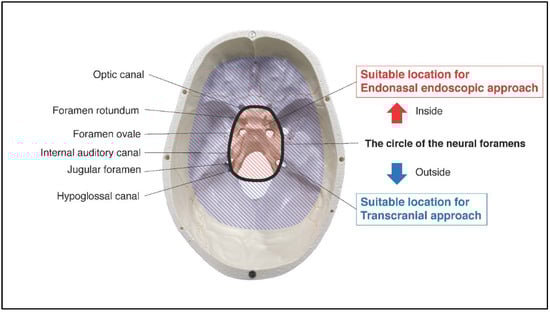 Red-striped region indicates the area with frequently resected by endonasal endoscopic approach. Blue-striped region indicates the area with frequently resected by transcranial approach. The border of them matched well the circle of the neural foramens (optic canal, foramen rotundum, foramen ovale, internal auditory canal, jugular foramen, and hypoglossal canal).