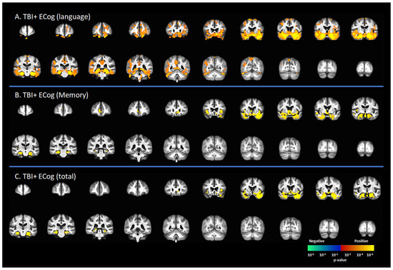 Correlation between [18F]-AV1451 SUVr maps and everyday cognition (ECog) scores in the population with a self-reported history of traumatic brain injury (TBI), with results of the correlations between tau deposition and (A) ECog-Language sub-test, (B) ECog-Memory sub-test, and (C) ECog-total score. Red-yellow represents a positive correlation between tau accumulation in people with self-reported history of TBI and ECog scores, while blue-green represents negative correlation between tau accumulation and ECog score.