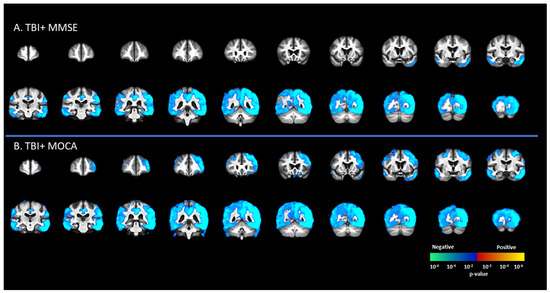 Correlation between [18F]-AV1451 SUVr maps and different cognitive test scores in the elderly population with a self-reported history of traumatic brain injury (TBI), with results showing negative correlations between tau deposition and (A) mini-mental state scale (MMSE) and (B) Montreal cognitive assessment (MOCA). Red-yellow represents a positive correlation between tau accumulation in people with self-reported history of TBI and cognitive scores, while blue-green represents negative correlation between tau accumulation and cognitive scores.
