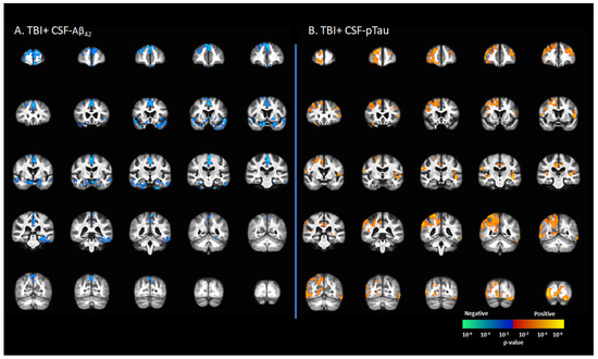 Correlation between [18F]-AV1451 SUVr maps and cerebrospinal fluid (CSF) biomarkers in the population with a self-reported history of traumatic brain injury (TBI), with results showing (A) negative correlations between CSF-Aβ42 and [18F]-AV1451 SUVr in brain; (B) positive correlation between CSF-pTau and [18F]-AV1451 SUVr in the brain. Red-yellow represents a positive correlation between tau accumulation in TBI+ cases and CSF biomarkers, while blue-green represents negative correlation between tau accumulation and CSF biomarkers.