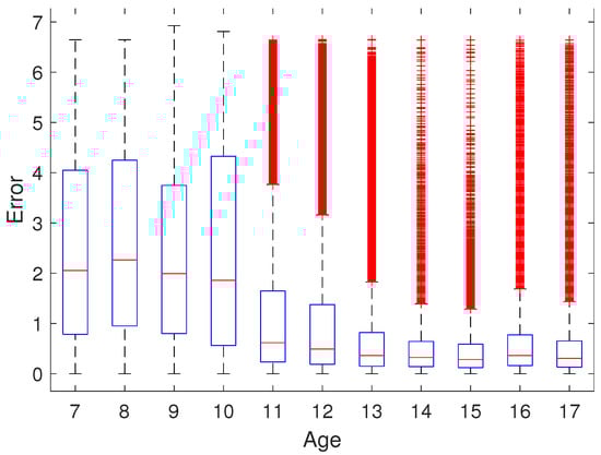 First, we analyze the influence of the age of the participant on the error committed with a multiple box plot. As a measure of error, the distance from the car to the centerline of the road was used. For each participant, this measurement was captured at a frequency of approximately 1/50. The results obtained for the absolute error are shown in Figure 2, where we can observe that the error median is higher for younger children and is quite similar after 13 years of age. Please, note that although, in some cases, there are quite a number of outliers (marked in red), all of them could belong to one or a few participants, since all the 34,496 positions of each participant are taken into account. It can also be observed that the error variability decreases with age.