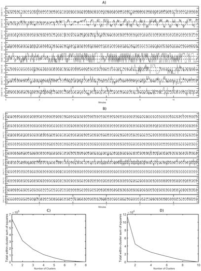 A k-means cluster analysis was performed. (A) The error graph over time for 11-year-olds. (B) The error graph over time for 17-year-olds. (C,D) show the scree plots with the number of clusters for 11-year-olds and 17-year-olds respectively.