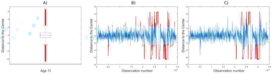 Once the children have been classified into the different groups, it is easy to identify those with a different behavior. In order to observe their attention pattern, we propose a procedure to determine when each participant loses/recovers attention with respect to his or her group of age. As an operational example, we will show the case of participant 11-6. Figure 4A shows the boxplot with the car positions for all children of that age, showing the outliers in red. These outliers are those observations with a value under Q1 − 1.5 IQR or with a value higher than Q3 + 1.5 IQR, being Q1 and Q3 the first and third quartiles respectively, and IQR the interquartile range. For this age, a non-outlier position interval of [−2.4, 2.6] for 11-year-olds is established. Figure 4B shows the trajectory positions of participant 11-6, with outlying positions marked in red. However, to study attention during this video game task, we will discard instantaneous punctual errors and only consider those errors that are committed for more than one second (sustained errors). Figure 4C shows this type of sustained errors in red. We observe that for this child sustained errors start from observation 20,617, i.e., after 6.87 min. Attention was recovered from observation 31,008, i.e., after 3.43 min of inattention and then it was maintained until the end of the task.