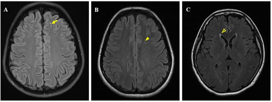 Fluid-attenuated inversion recovery images. (A) Near-cortical white matters (yellow arrow), (B) deep white matter lesions (yellow solid arrow), and (C) paraventricular matter lesions (yellow hollow arrow).